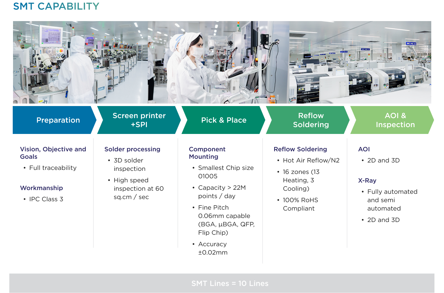 Equipped with high-precision, SMT production lines (01005 capable), we provide full support for our customer whether it is high-mixed, low volume or full-scale high-volume production from PCBA to final product level with flexible logistic models