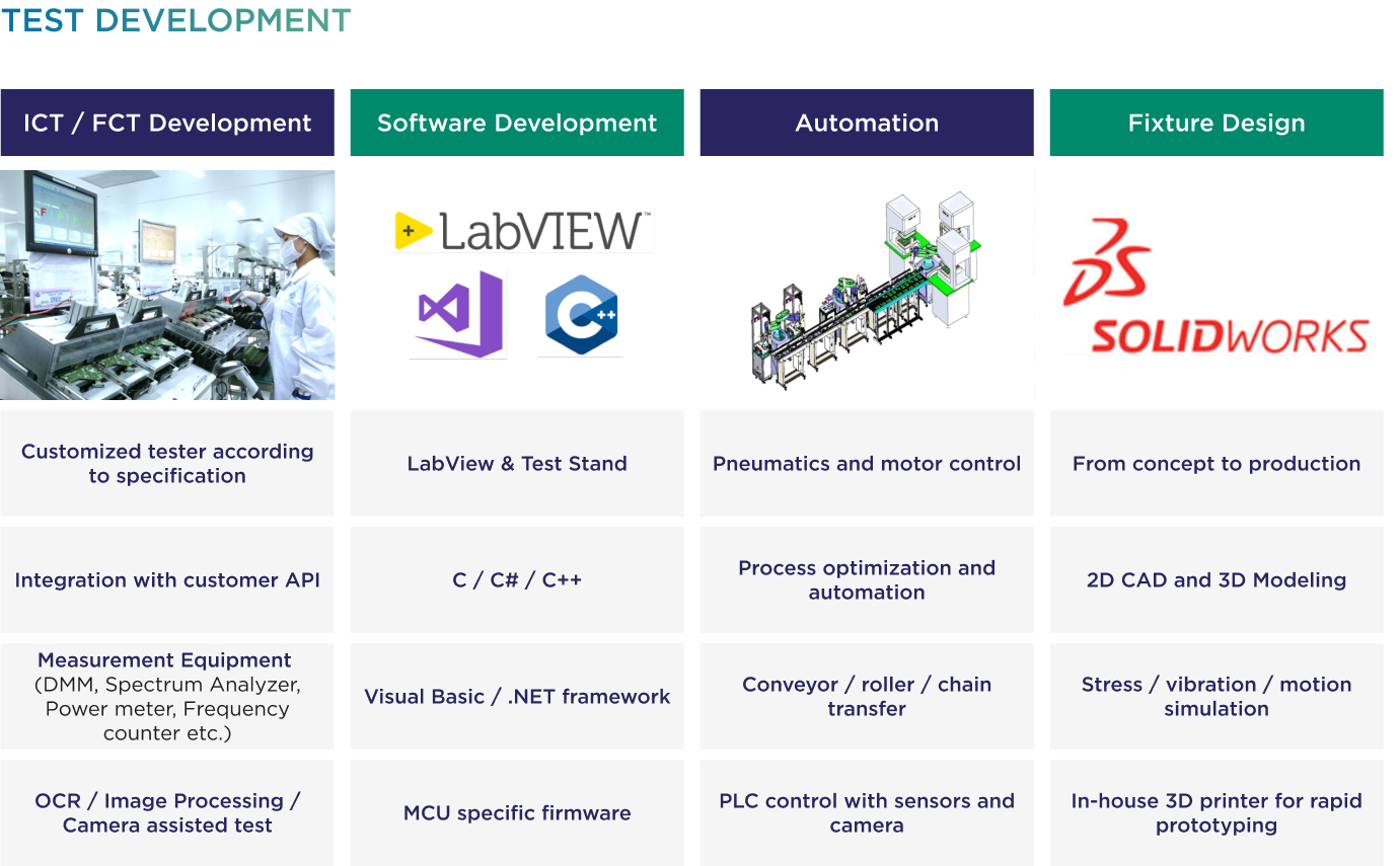 Our in-house test development supports design, assembly, and deployment across products, offering comprehensive solutions for both testers and software to meet customer specifications.