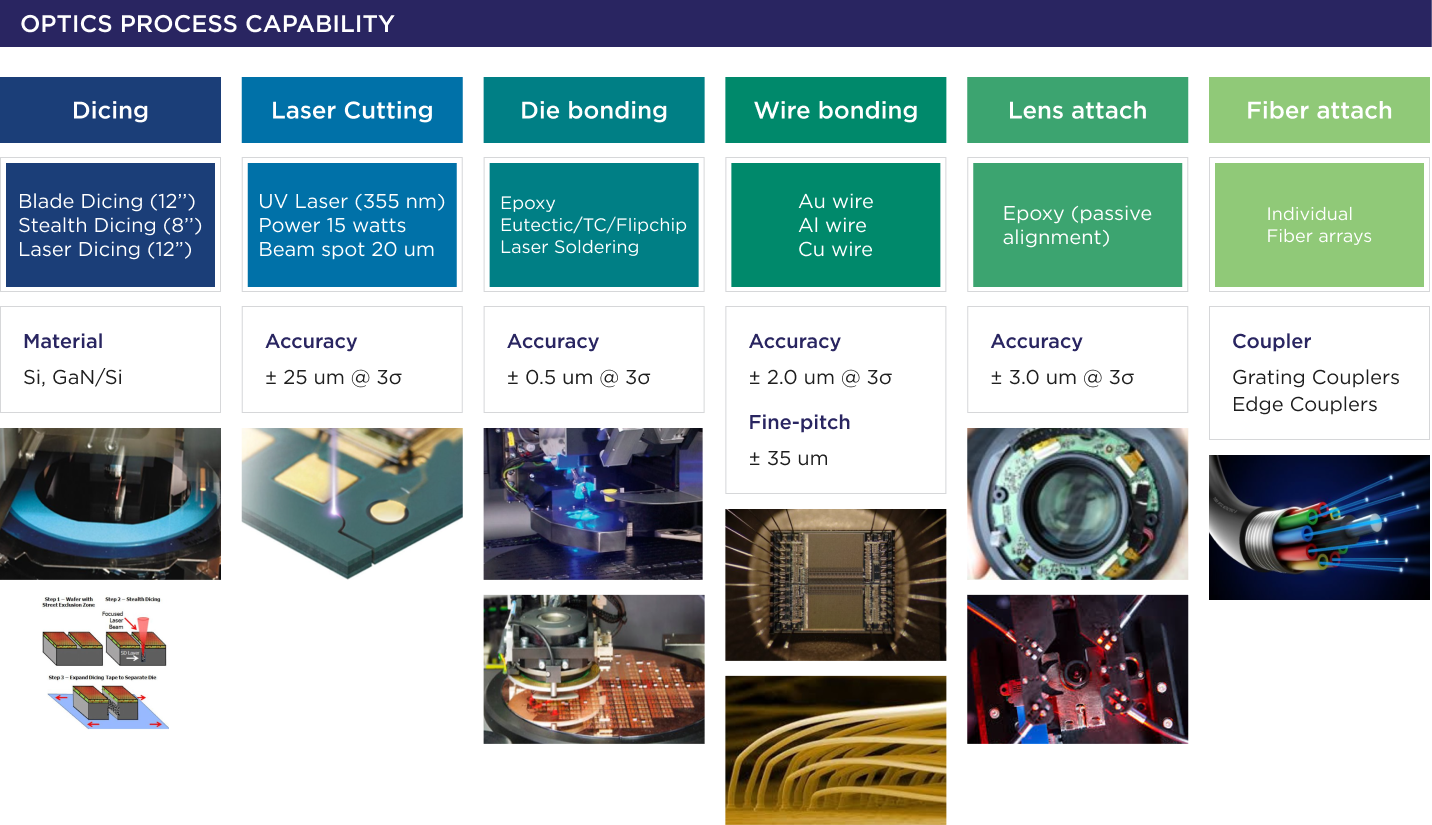 Stars Microelectronics provides end-to-end Photonic Manufacturing Solutions. By leveraging experience from our advance OSAT and EMS businesses together with deep understanding of precision optics requirements, we provide unique services combined the science of photonics at wafer level (Silicon Photonics) with practical & optimized assembly on product level with advance technology to handle complex optical integration (passive/active optical alignment, lens calibration etc.) with talent, know-how, and precision.
